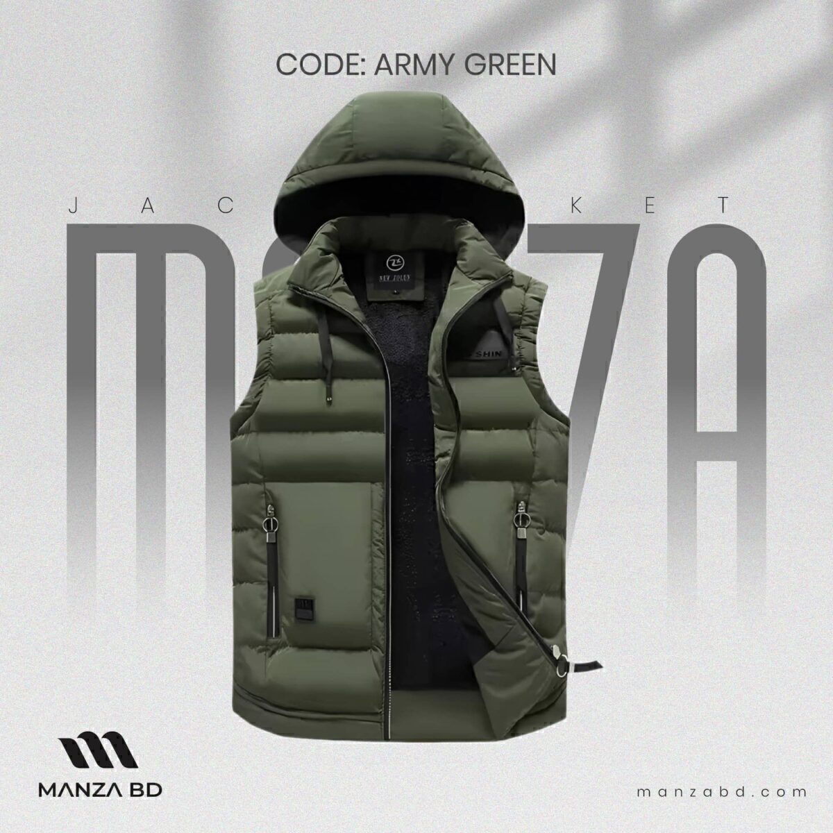 Green Hooded Outdoor Vest – Breathable Cotton-Polyester Padded Jacket for Men