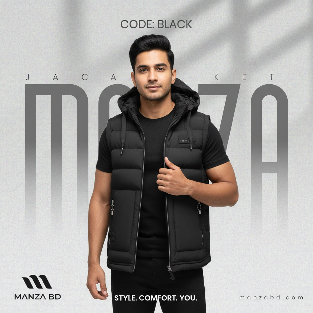 Black Hooded Street Vest – Cotton Padded, Multi-Pocket Winter Waistcoat for Men