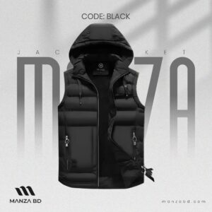 Black Hooded Street Vest – Cotton Padded, Multi-Pocket Winter Waistcoat for Men